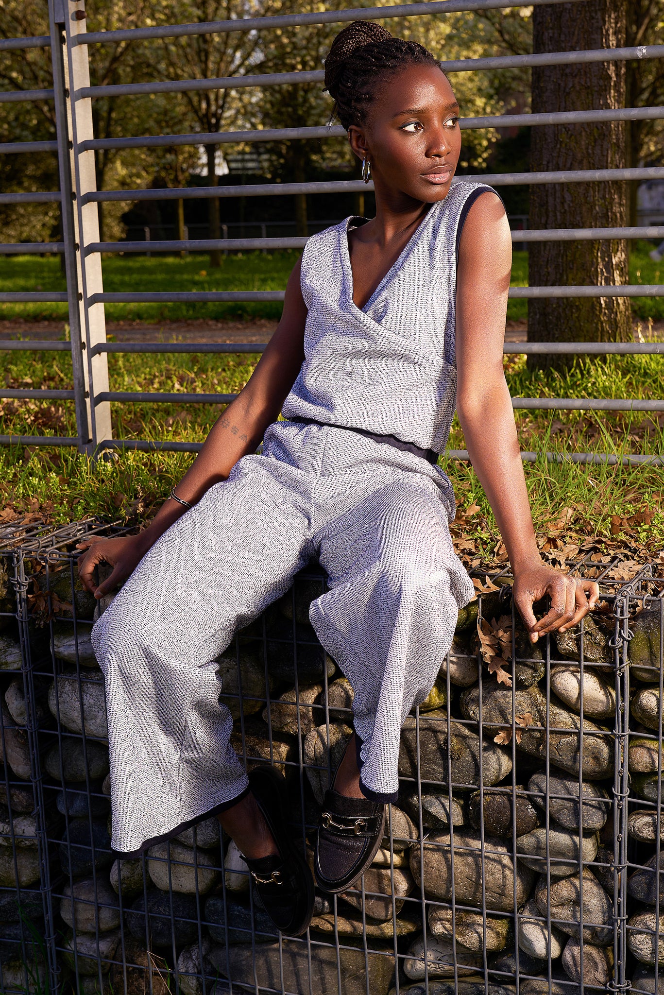 Tuta con scollo a V e elastico in vita, pensata per offrire comfort e valorizzare la figura con semplicità. La gamba dritta a palazzo dona eleganza e libertà di movimento, rendendola perfetta per accompagnarti con disinvoltura durante tutta la giornata.