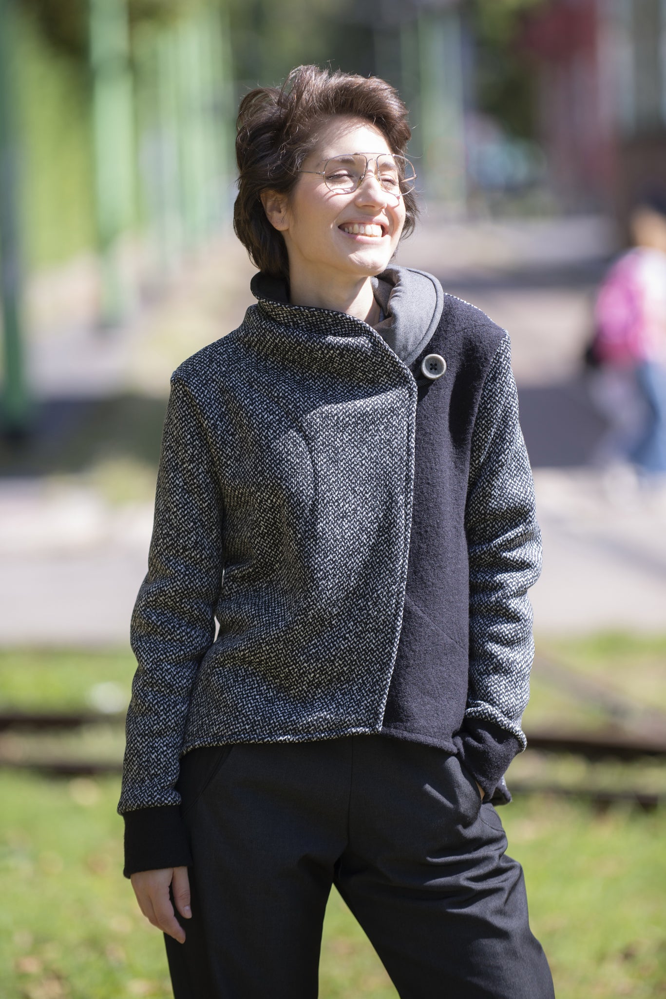 Leggermente sciancrata,e con un taglio leggermente più lungo dietro offre una vestibilità comoda che si adatta a tutte le fisicità. Il collo ampio a scialle e l'apertura laterale aggiungono movimento e originalità al design. Puoi chiuderla con un grande bottone esterno e un pratico bottone interno a calamita, oppure indossarla aperta come un cardigan.
