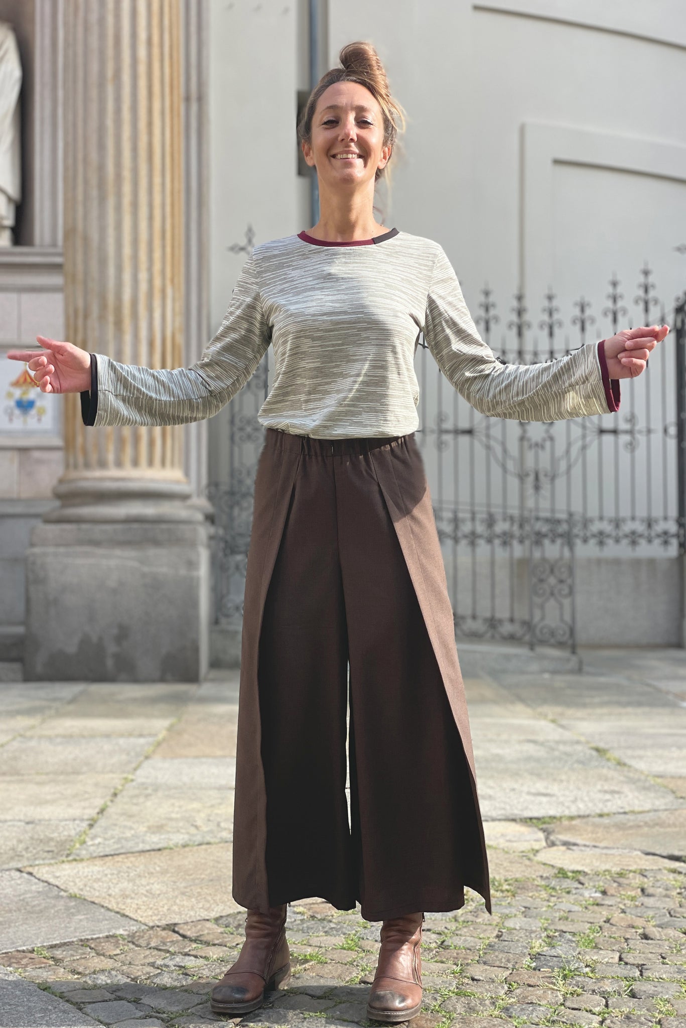 La silhouette della gamba è ampia e ariosa, studiata per garantire libertà nei movimenti e per donare un senso di leggerezza a ogni passo. La particolarità del capo sta nella sua struttura: la gamba è suddivisa in due pannelli, creando un effetto dinamico e fluido che ricorda quello di una gonna, pur mantenendo la praticità dei pantaloni.