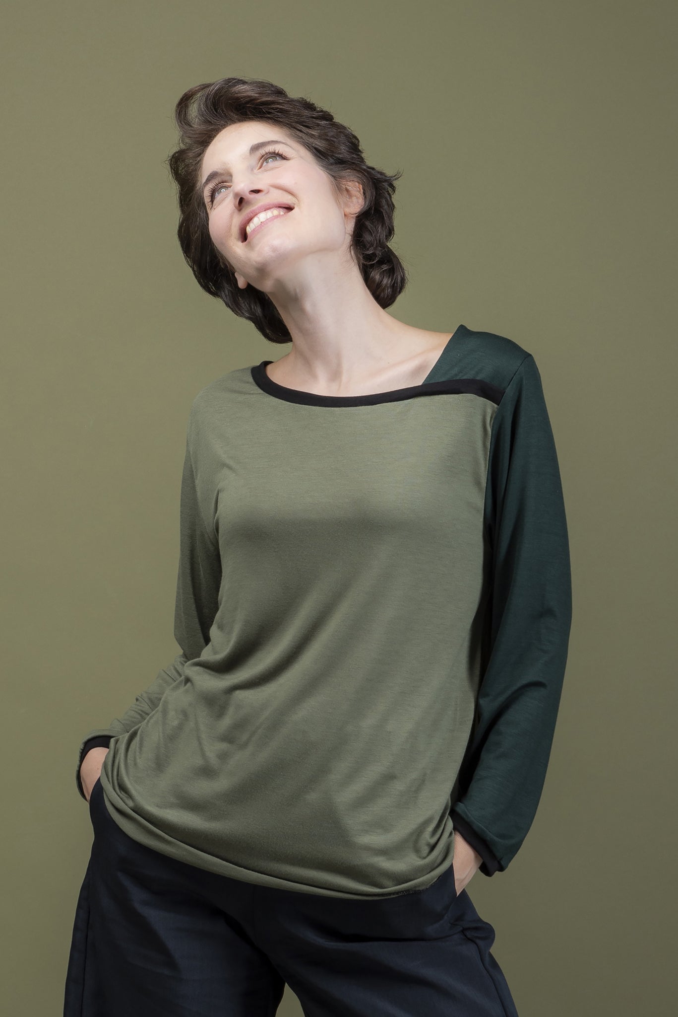 T-shirt dal design asimmetrico con una combinazione di pannelli di tessuto in contrasto colore. Le maniche lunghe hanno un taglio classico per garantire comodità e libertà di movimento. Lo scollo è arrotondato, con un dettaglio di cucitura che lo arricchisce e definisce la linea del colletto. Il modello leggermente svasato si adatta in modo fluido al corpo senza essere costringerlo