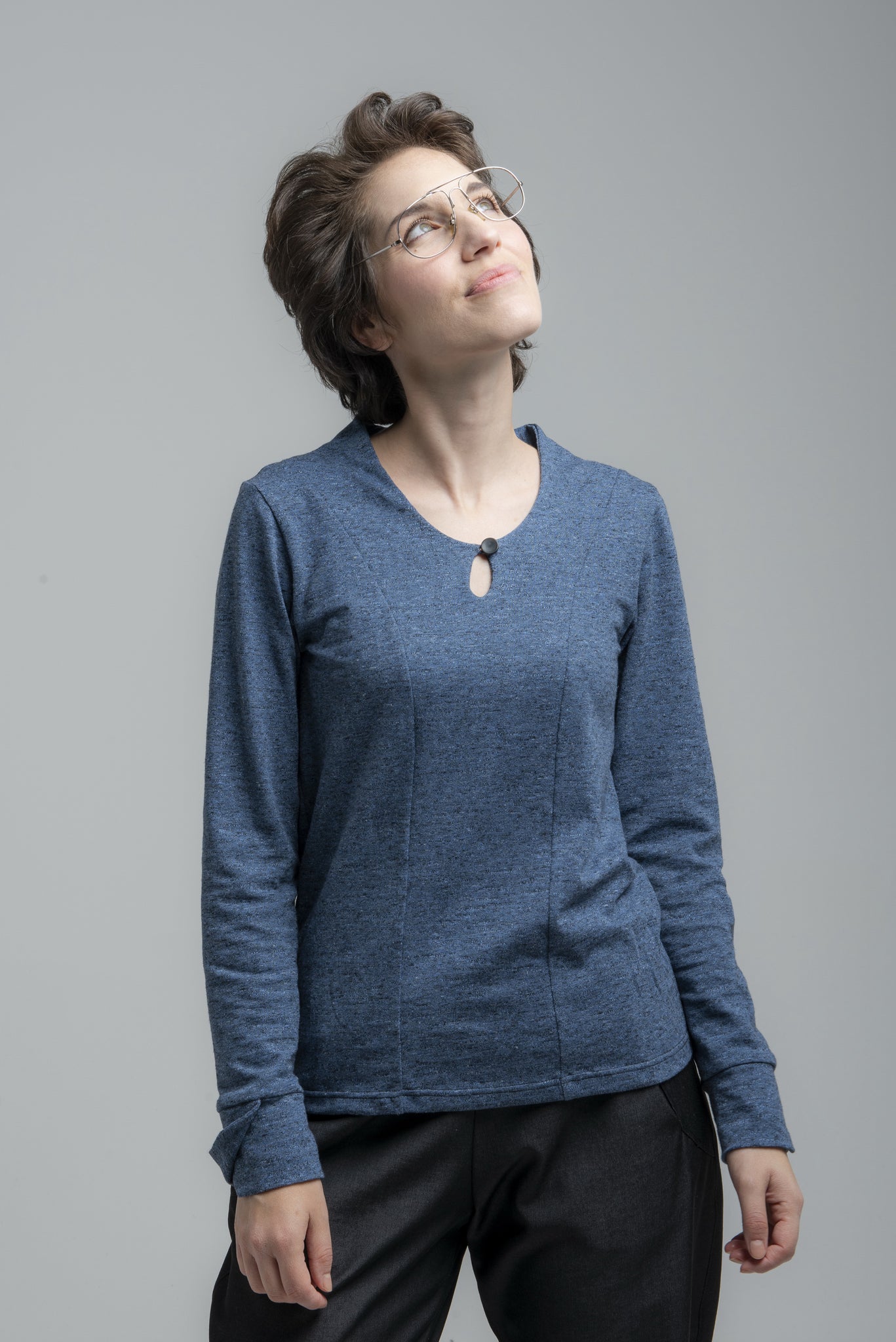 Camicia realizzata in jersey di cotone leggermente elasticizzato. Il modello ha un taglio diritto garantendo una vestibilità comoda. Le maniche lunghe hanno polsini aperti e risvoltabili che aggiungono un tocco sfizioso. Davanti è arricchita da una piccola apertura a forma di goccia, chiusa da un bottone decorativo.