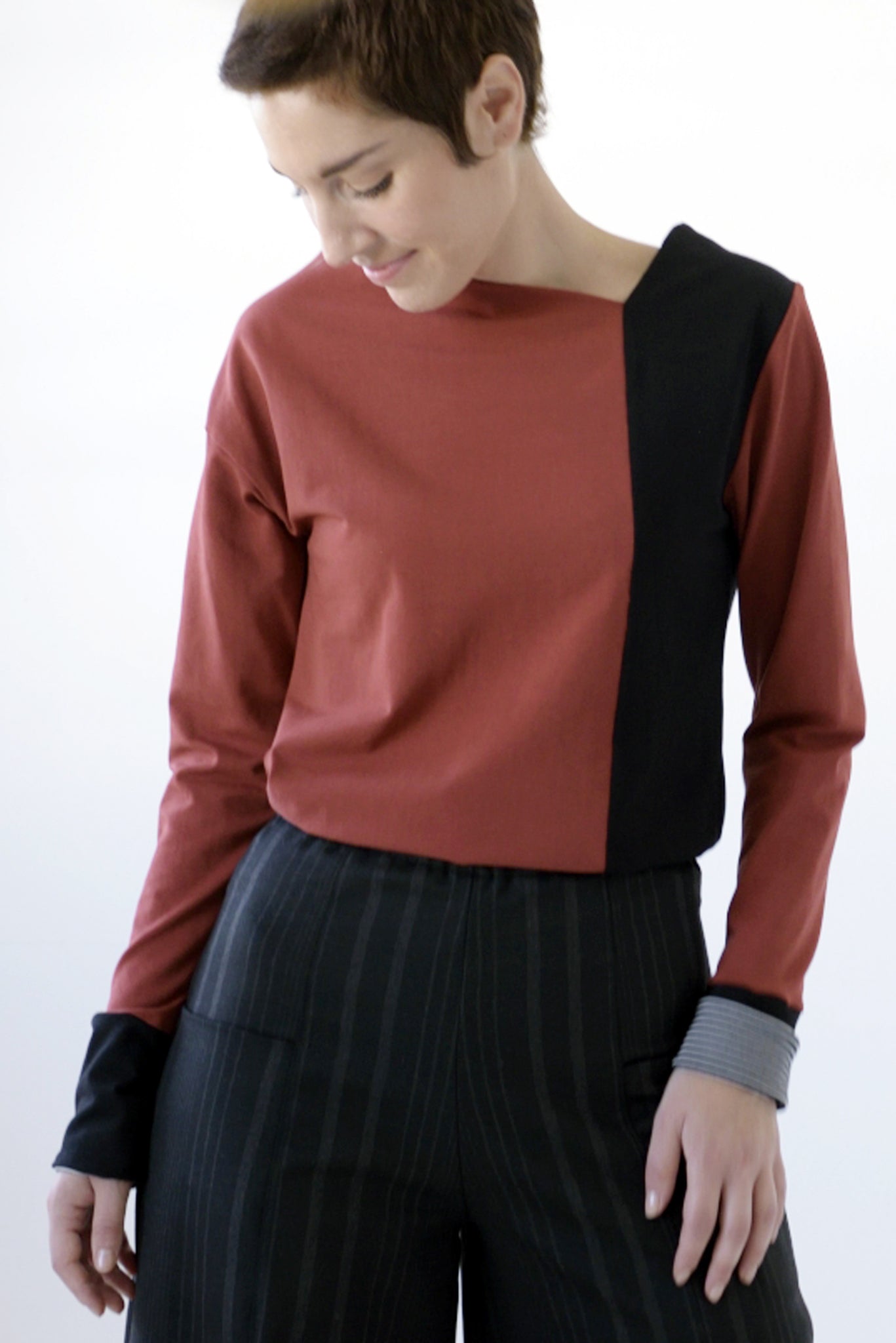 T-shirt in jersey di cotone, leggermente elasticizzato e morbido sulla pelle. Vestibilità morbida su seno e fianchi. scollatura asimetrica valorizzata dal contrasto dei colori. Spalle larghe e maniche con polsini risvoltabili con tessuto diverso la lunghezza ti permette di indossarla dentro o fuori a pantaloni e gonne!
