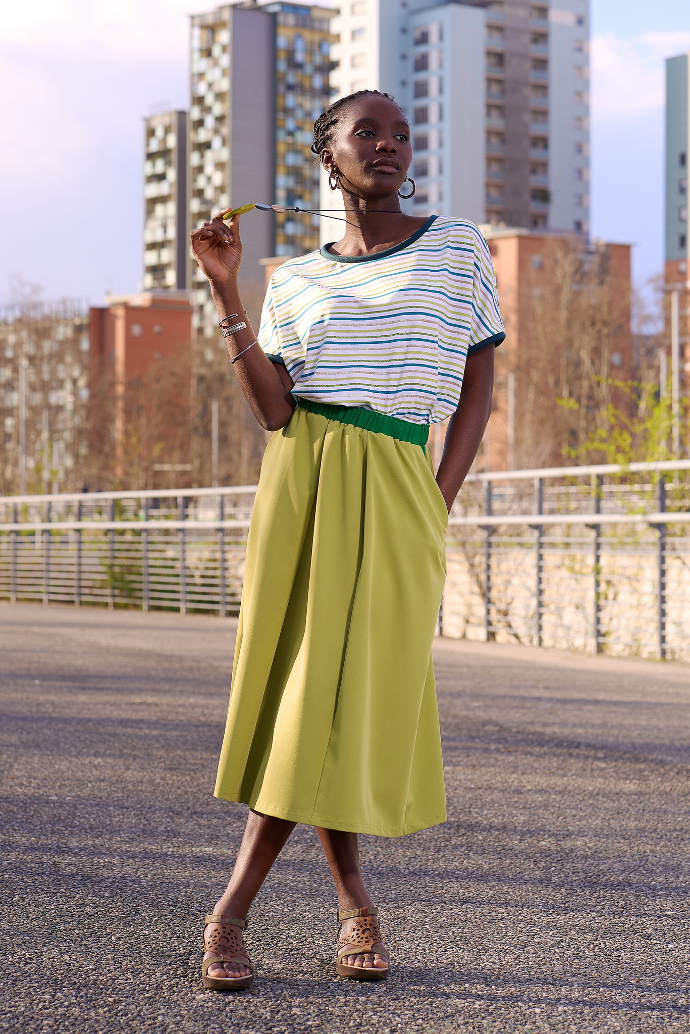 Gonna a forma tubolare che cade in modo fluido fino a sotto il ginocchio (è possibile averla in diverse lunghezze). Le ampie pieghe davanti e dietro aggiungono volume sui fianchi, creando un effetto strutturato ma morbido. L'elastico in vita offre una vestibilità adattabile a diverse fisicità. Due ampie tasche laterali per una maggiore comodità. Il taglio semplice la rende un capo molto versatile, perfetto per un look sia casual che elegante.