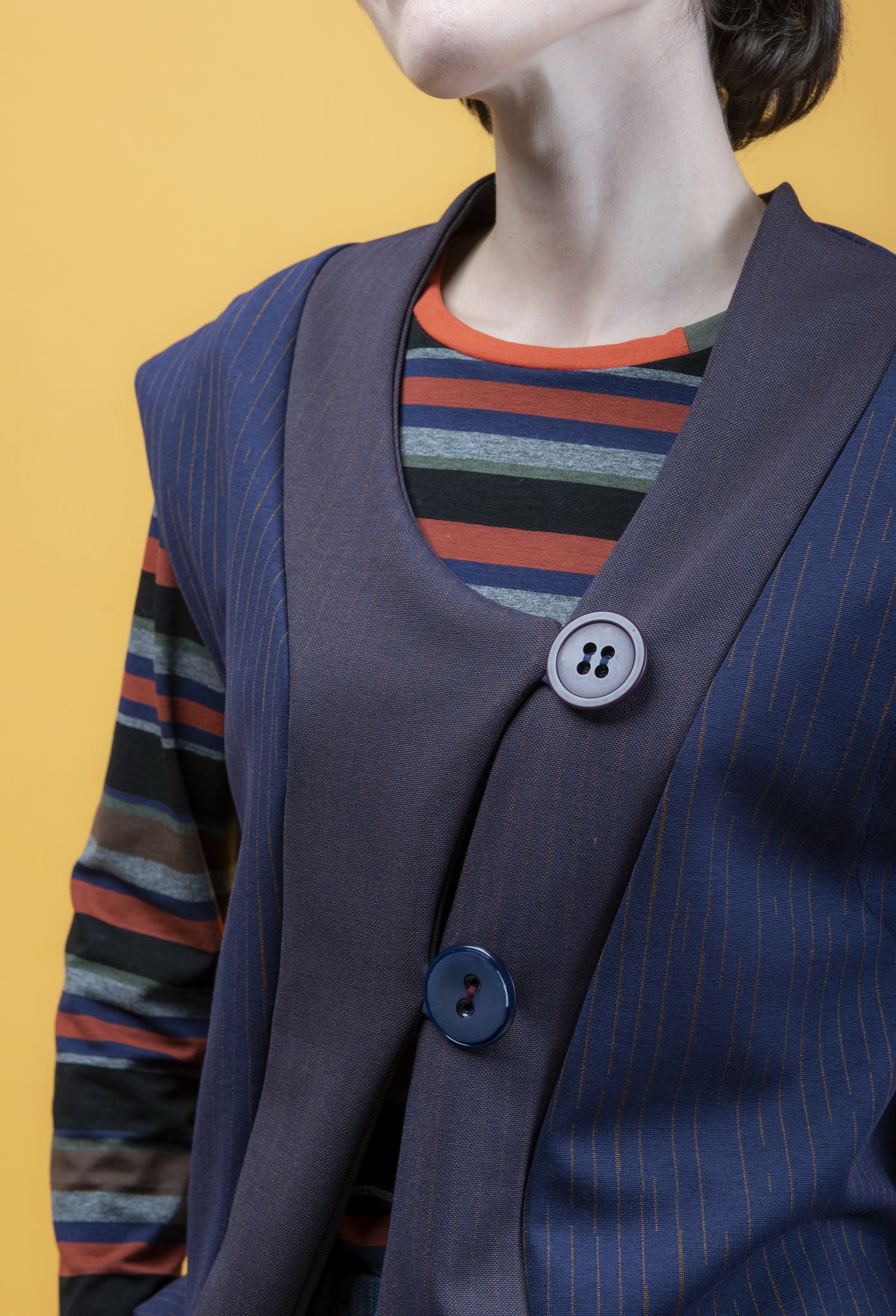 Gilet asimmetrico in tessuto morbido e leggermente elasticizzato, perfetto per sentirsi comodi e a proprio agio. La scollatura particolare a forma di goccia è valorizzata da bottoni vintage. La vestibilità è ampia e avvolge con naturalezza spalle, seno e fianchi.