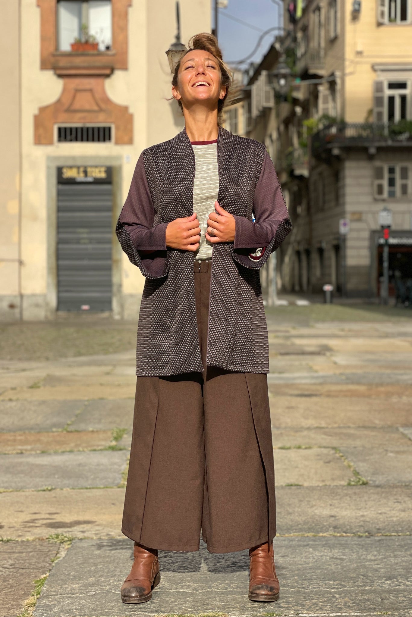 Il modello Sofia può essere indossato sia come giacca che come cardigan. Ha una vestibilità ampia, cade morbido e copre i fianchi. La forma del collo è alla coreana e risvoltabile. Le maniche sono bicolore e hanno un apertura laterale. Lo spacco posteriore regala fluidità al movimento, rendendo ogni passo più piacevole. Versatile e facile da abbinare, questo capo è l'equilibrio perfetto tra comfort e stile.