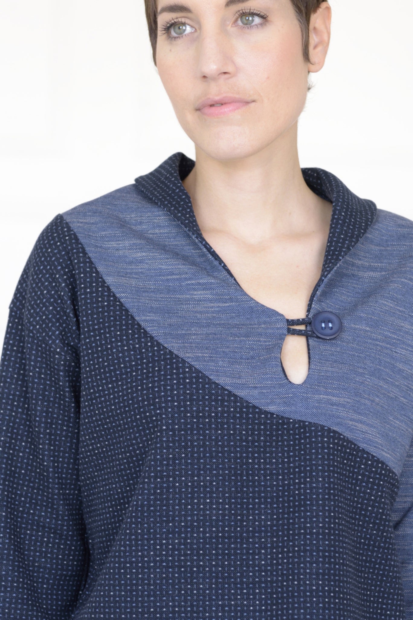 La scollatura è asimmetrica e si chiude con un bottone. Colletto risvoltabile.